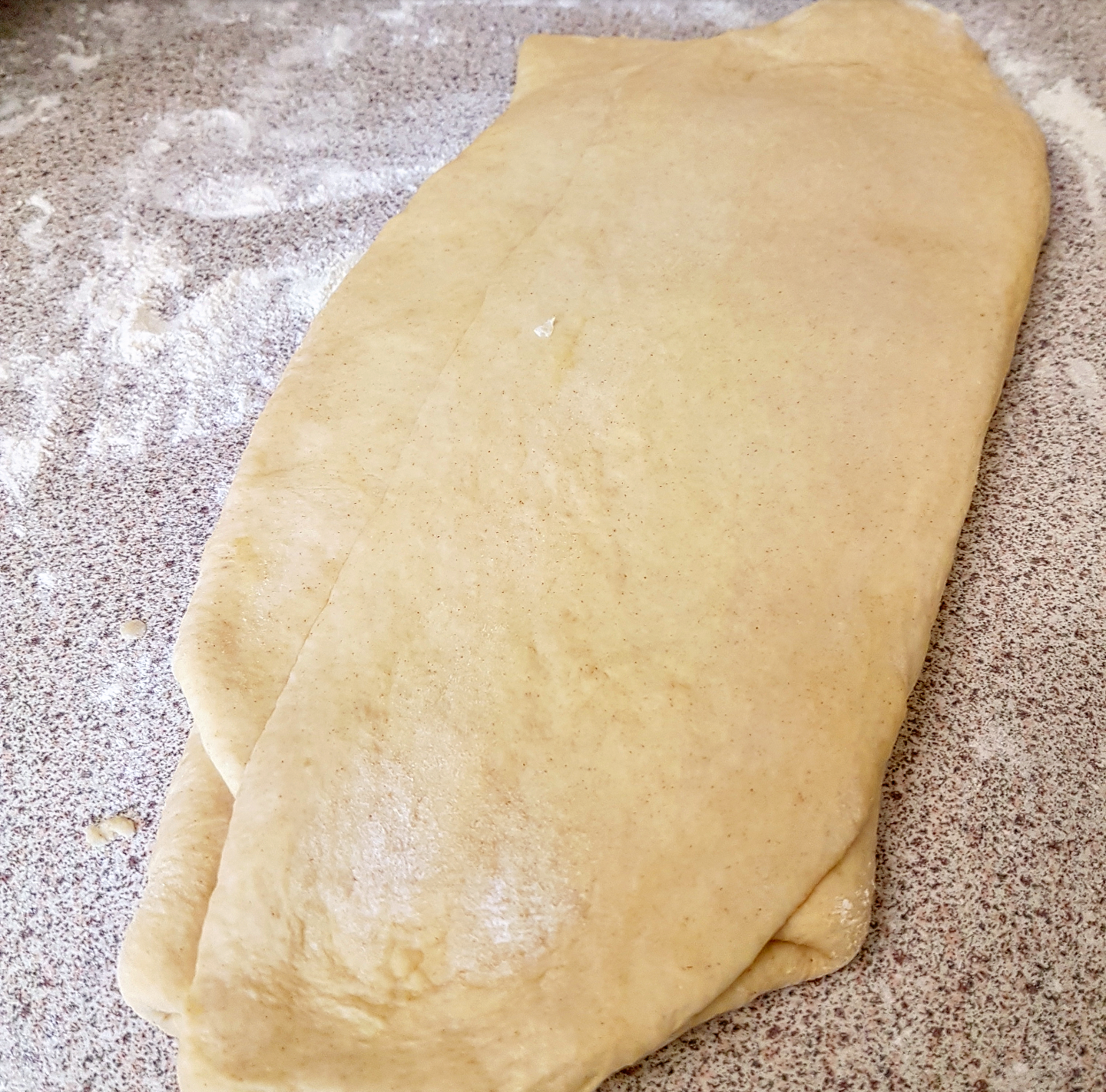 After putting flour on the side and taking the dough out of the fridge William rolled the dough into a rough rectangle. The most difficult part was to tell him not to roll too hard so the dough kept a marble effect with the butter.
