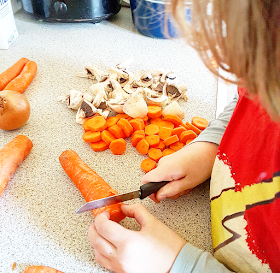 With the ingredients cooking William peeled and chopped the potatoes to add to the mixture later. We had already filled the slow cooker with all of the above ingredients as we ran out of room to add the potatoes but he placed these in a saucepan full of water for later.